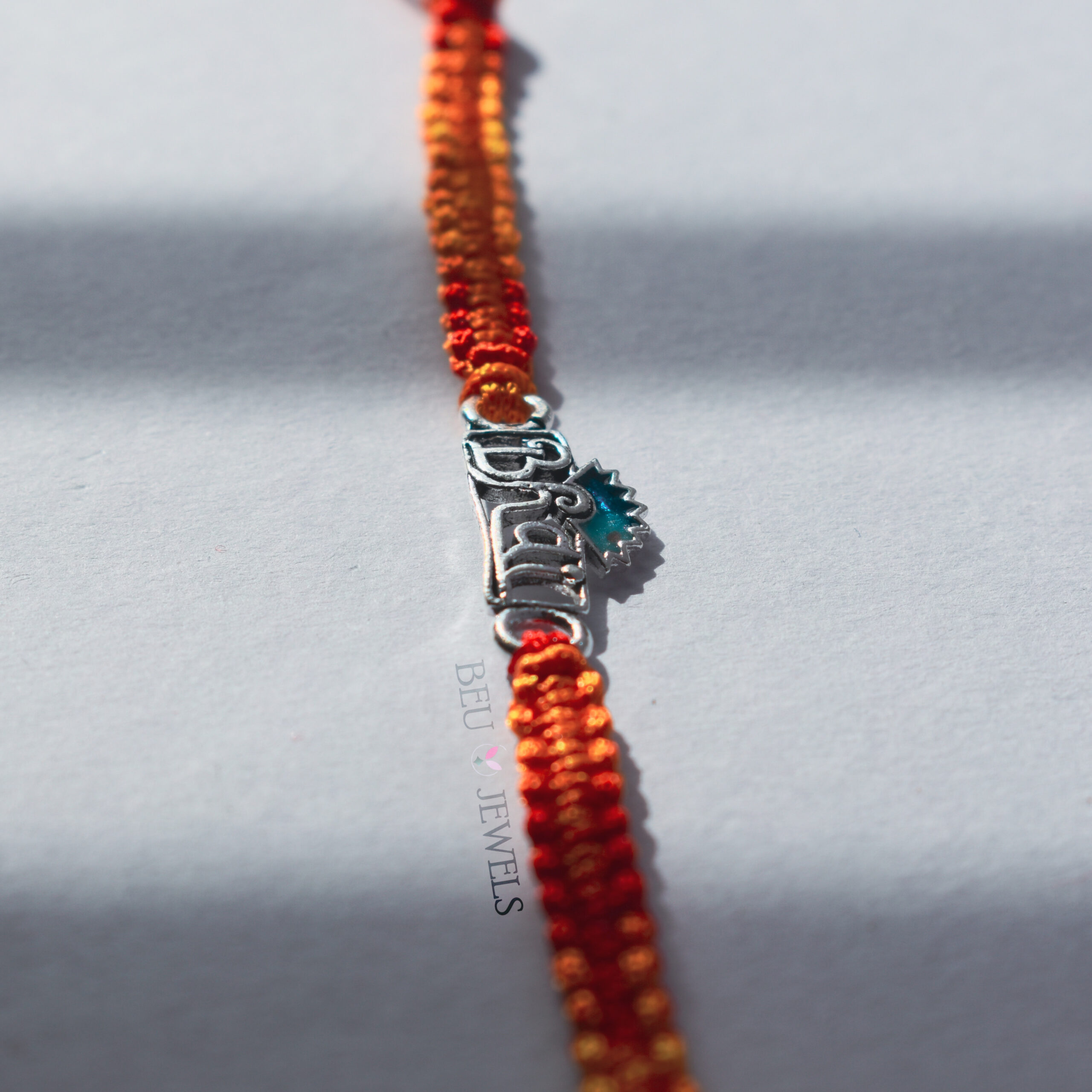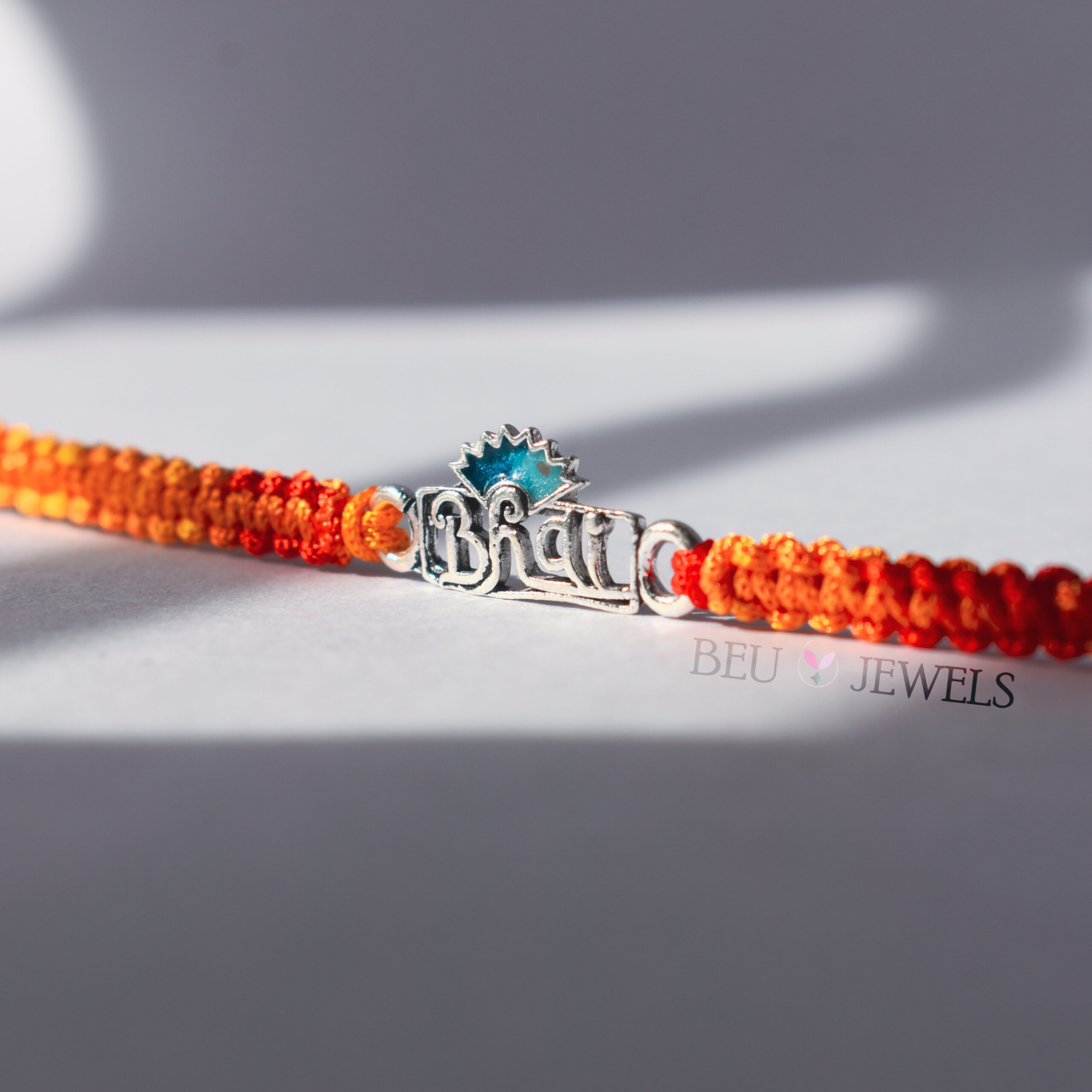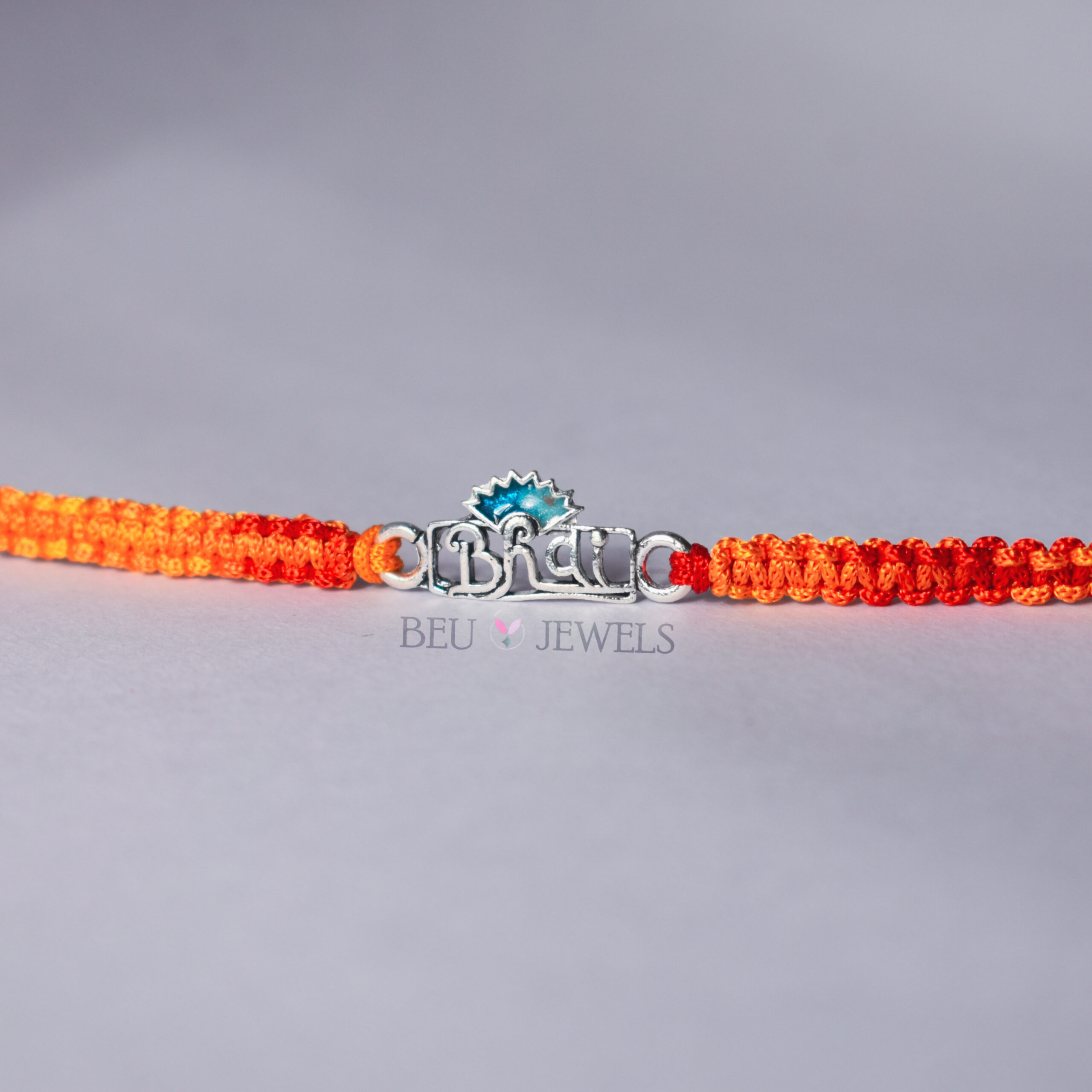 Commemorate this Raksha Bandhan with our ‘Bhai’ Rakhi, featuring a striking blue feather and elegant silver oxidised design. This unique rakhi highlights the special bond with your brother, blending modern flair with tradition.